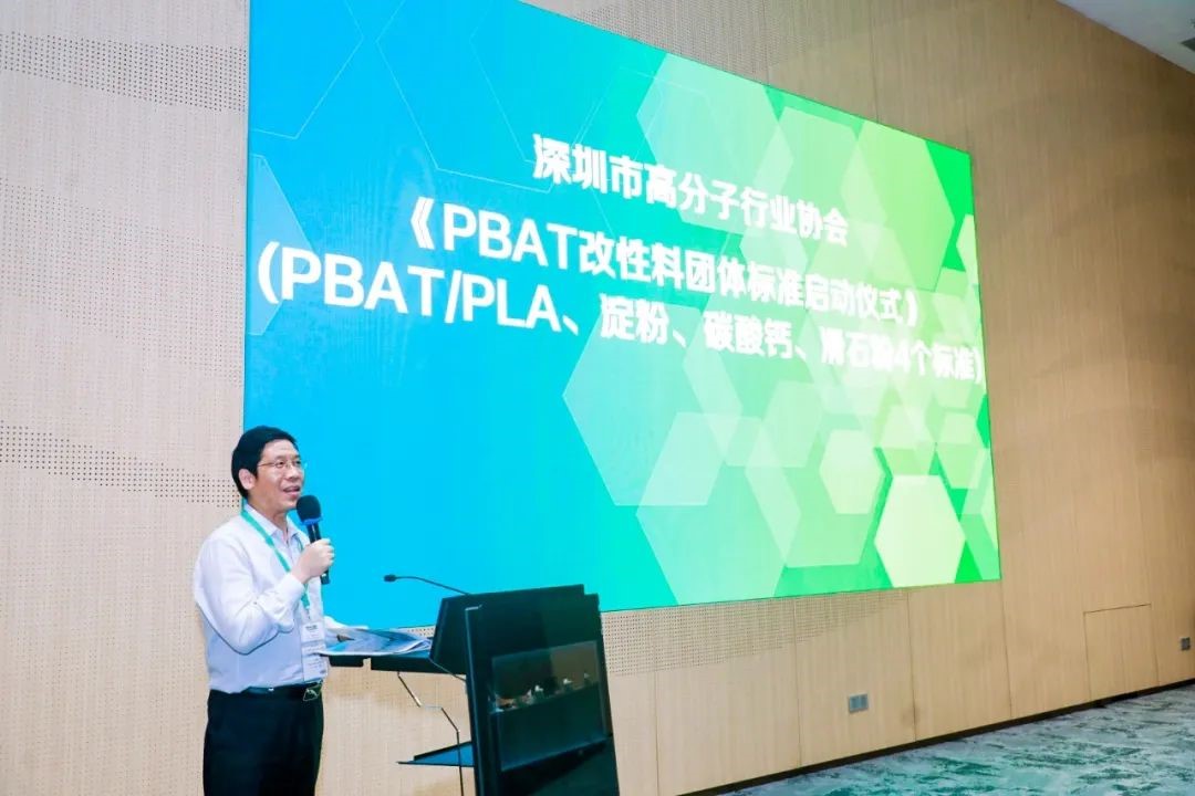 教授代表深圳市高分子行业协会宣读《关于征集PBAT 系列改性料团体标准及行业标准参编单位的通知》,呼吁大家积极参与PBAT/PLA、淀粉、碳酸钙、滑石粉 4 个标准的制定,共同推进行业发展。