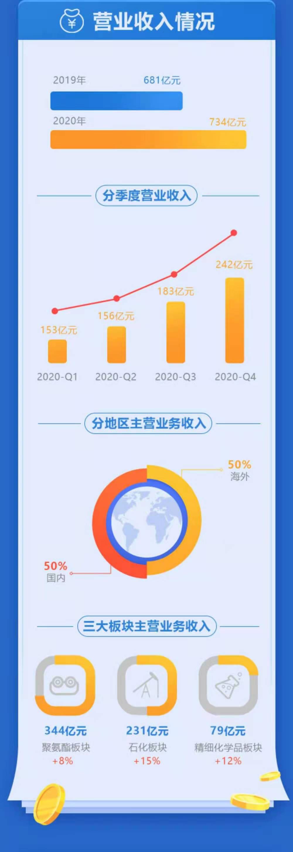 近日,万华化学发布了2020年年报()。万华去年实现销售收入734.33亿元,同比增加7.91%;实现归属于上市公司股东的净利润100.41亿元,同比下降0.87%。