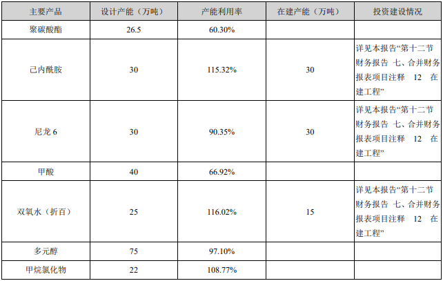 公司主营业务包括化工新材料、基础化工、化肥产品及其他业务,其中化工新材料产品主要包括聚碳 酸酯、尼龙6、己内酰胺、多元醇等;基础化工产品主要包括甲烷氯化物和二甲基甲酰胺等;化肥产品主 要包括复合肥等;其他业务主要包括化工装备制造、化工行业相关设计研发等。