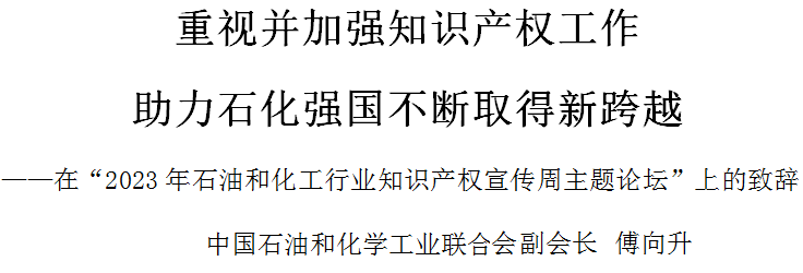 编者按:4月26日,中国石油和化学工业联合会在京召开“2023年石油和化工行业知识产权宣传周主题论坛”。中国石油和化学工业联合会副会长傅向升发表题为《重视并加强知识产权工作 助力石化强国不断取得新跨越》的致辞。今日特刊发全文,以飨读者。