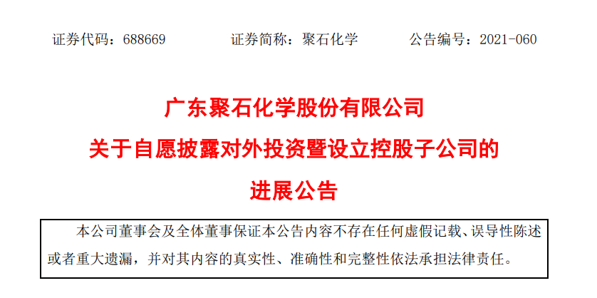 7月18日,广东聚石化学股份有限公司(以下简称“聚石化学”)发布公告,拟在湖南安仁县集中区投资不超过1.6亿元建设改性塑料粒子及电线电缆制品生产基地项目,同时,聚石化学设立控股子公司湖南聚石科技有限公司,注册资本为5000万元,聚石化学持股占比65%,并以新设公司为项目实施主体。