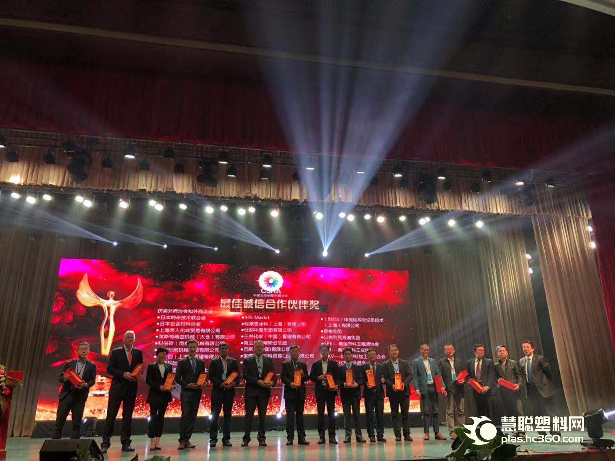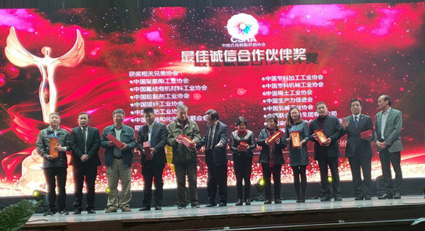 协会对20年来诚信合作的外商协会和外商企业颁发“最佳诚信合作伙伴奖”。获奖企业有日本纳米技术联合会、日本复合材料协会、上海帝人化成贸易有限公司、莱斯特瑞兹机械(太仓)有限公司、科倍隆(南京)机械有限公司、上海松耐机械制造有限公司、科思创(上海)管理有限公司、沙特基础工业公司、(BUSS)康庞廷成套设备技术(上海)有限公司、科莱恩涂料(上海)有限公司、杜邦中国集团有限公司、三井化学(中国)管理有限公司、荷兰皇家帝斯曼集团、巴斯夫(中国)有限公司、宝理工程塑料贸易(上海)有限公司、LG化学、IHS Markit、荣格集团、以色列死海溴集团、SPE---美国塑料工程师协会、SPI(NPE北京办)---美国塑料工业协会、GKV---德国塑料加工业联合会、中德文化交流促进会、克劳斯玛菲(浙江)有限公司、马格澳迈塑料机械(上海)有限公司、国际化学品制造商协会、霍尼韦尔(中国)有限公司、索尔维集团、朗盛化学、阿科玛(中国)投资有限公司、中欧汽车轻量化联盟。