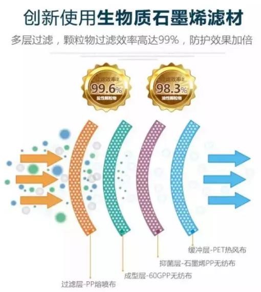 而对常规油性颗粒物及盐性颗粒物的过滤效率上,经国家专业机构检测,此款口罩可实现接近98%的过滤效率,完全符合我国KN95防护级别。对空气中唾液飞沫、PM2.5、花粉、粉尘等均具有很好的过滤效果。强大的过滤性能、独特的功能设计、严格的工艺要求、生物质石墨烯黑科技材料的应用,这些特点都让此款口罩成为超越洋品牌的匠心国货,目前已经通过国家GB/T 32610-2016标准检测和特种劳动防护用品安全认证(LA认证)。